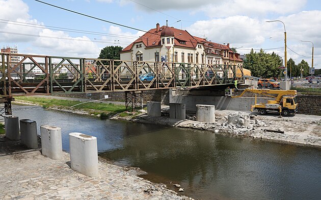 V Opavě začala stavba nového mostu přes řeku Opavu. Původní most poničila loni v září povodeň a dosud ve velmi frekventované Ratibořské ulici funguje provizorní přemostění. (17. června 2025)