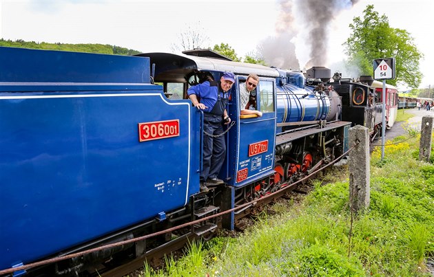 Osoblažská úzkokolejka vyjela, na snímku lokomotiva Malý štokr (modrý lak), za ní Rešica. (8. května 2014)