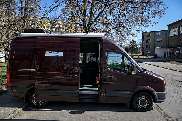 Mobilní služebna ostravské městské policie nedaleko ubytovny Soiva v ostravském obvodu Jih. (20. března 2025)
