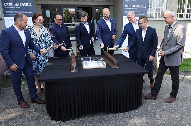 Tradiční poklepání, ale na symbolické kolejnice, nových vysokoškolských kolejí Ostravské univerzity na Slezské Ostravě. (19. července 2025)