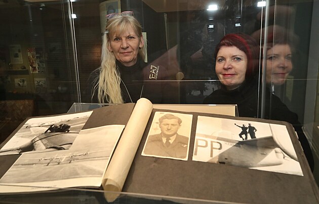 Ředitelka Slezského zemského muzea v Opavě Jana Horáková (vlevo) a vedoucí Památníku 2. světové války v Hrabyni Kamila Poláková u osobních dokumentů letce RAF Boleslava Ivánka v rámci nové výstavy s názvem Příběhy války – Severní Morava a Slezsko 1945. (3. dubna 2025)