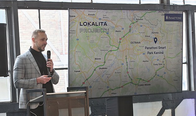 Matěj Hejma z developerské společnosti Panattoni představuje projekt u Karviné. (21. listopadu 2024)