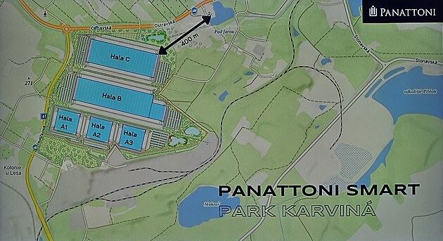 Rozmístění hal na mapě s vyznačenou vzdáleností od tzv. Šikmého kostela (21. listopadu 2024)