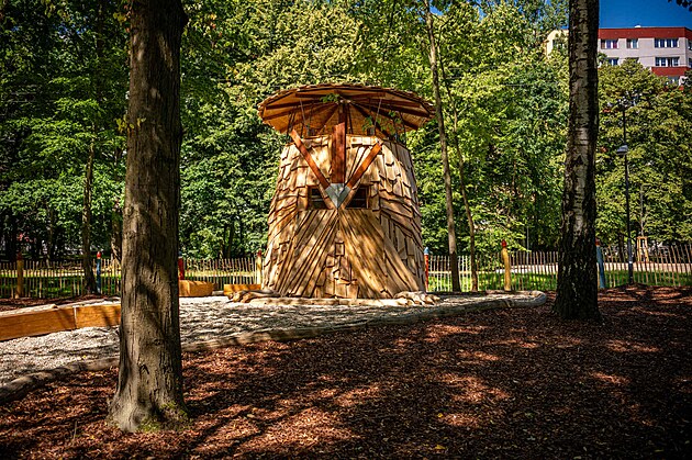 Nově dokončený Park nad rybníkem v ostravském Bělském lese nabízí zábavu dětem a relax dospělým. Toto místo hlídá socha obryně vytesané z dubu a z akátu. (1. července 2025)