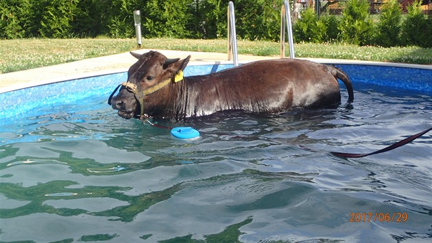 „Po vyčerpání vody v bazénku položili krávě provizorní mostek před nohy, majitel ji začal lákat nahoru kbelíkem s chutným krmivem a několik hasičů motivovalo nebohé zvíře k vylezení ven intenzivním tlačením svými silnými pažemi, hlavně do zadních partií,“ pokračoval.