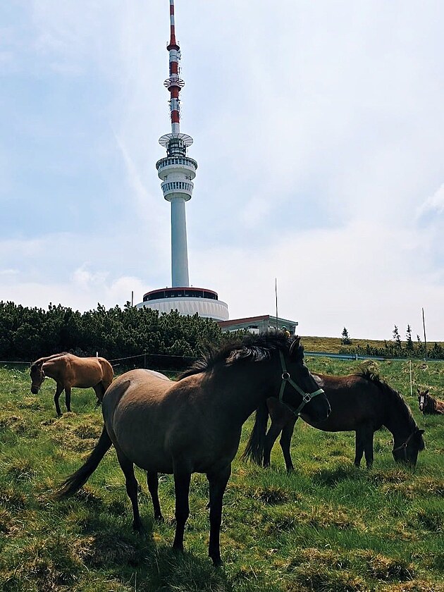 Pod vysílačem Praděd se pase stádo šesti huculských koní.