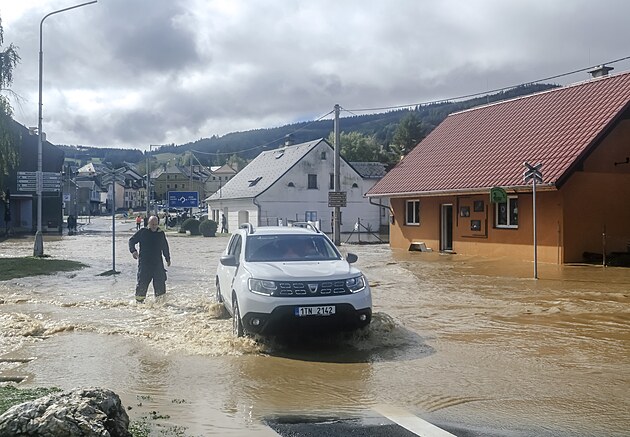 Vrbno pod Pradědem a Heřmanovice jsou odříznuté od okolí. Vrbnem se nedá projet, řeka teče přes silnici ke kruhovému objezdu a hlavní křižovatce. Lidé už několik hodin čekají, až se budou moct dostat pryč. (15. září 2024)