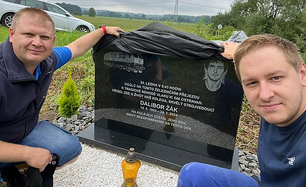 Strojvůdci z bohumínského depa Českých drah odhalili pomník věnovaný jejich kolegovi Daliborovi Žákovi, který loni v lednu tragicky zahynul na železničním přejezdu v Dolní Lutyni na Karvinsku. Na fotografii spoluiniciátoři pomníku, David Brzeźniak (vlevo) a Marek Sobaniec. (28. července 2025)