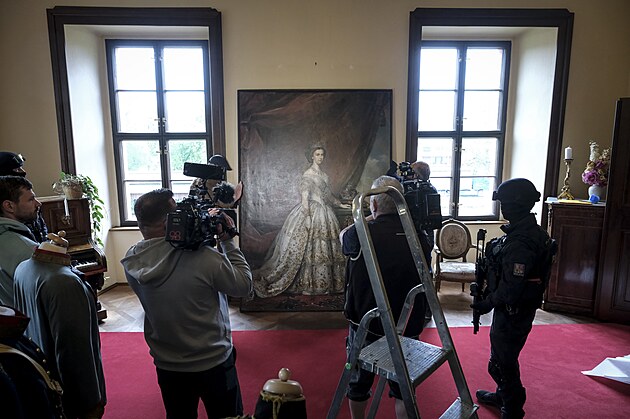 Zámek v Kuníně na Novojičínsku hostí unikátní obraz rakouské císařovny Sissi, portrét se od konce května do konce října stane součástí výstavy. Na převoz dohlíželi policejní těžkooděnci. (6. května 2025)