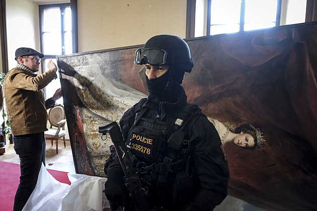 Zámek v Kuníně na Novojičínsku hostí unikátní obraz rakouské císařovny Sissi, portrét se od konce května do konce října stane součástí výstavy. Na převoz dohlíželi policejní těžkooděnci. (6. května 2025)