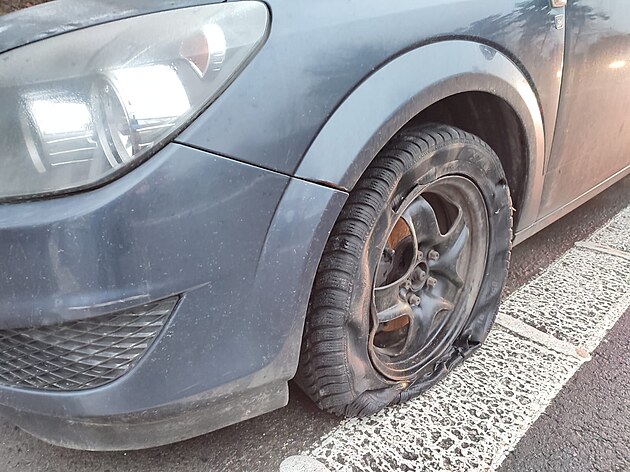 Auto s poškozenými pneumatikami a disky po průjezdu kruhovým objezdem rovně opilý řidič odstavil u krajnice.