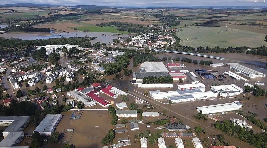 Areál Kofoly v Krnově zcela pohltila povodeň. Výroba se zatím v tomto podniku zastavila. (16. září 2024)