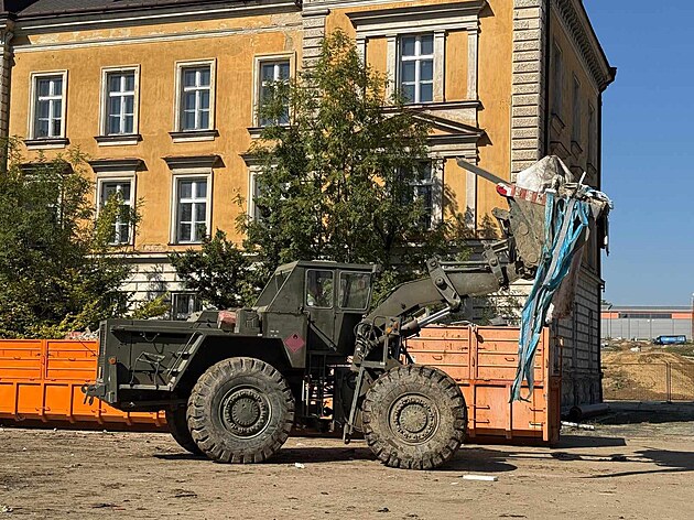 Tuny odpadu, které vznikly během popovodňového úklidu, zaplnily areál Dukelských kasáren v Opavě.