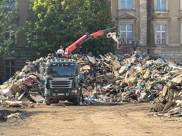 Tuny odpadu, které vznikly během popovodňového úklidu, zaplnily areál Dukelských kasáren v Opavě.