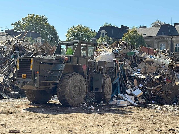 Tuny odpadu, které vznikly během popovodňového úklidu, zaplnily areál Dukelských kasáren v Opavě.