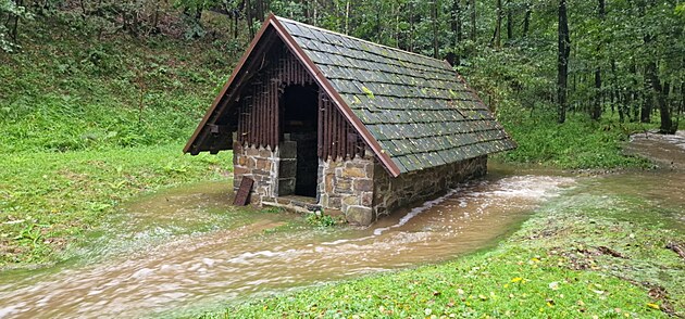 Vyplavený areál pstruží farmy Bělá na Opavsku, odkud odplavalo přes tunu pstruhů. (27. září 2024)