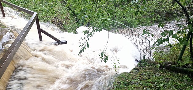 Vyplavený areál pstruží farmy Bělá na Opavsku, odkud odplavalo přes tunu pstruhů. (27. září 2024)