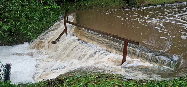 Vyplavený areál pstruží farmy Bělá na Opavsku, odkud odplavalo přes tunu pstruhů. (27. září 2024)