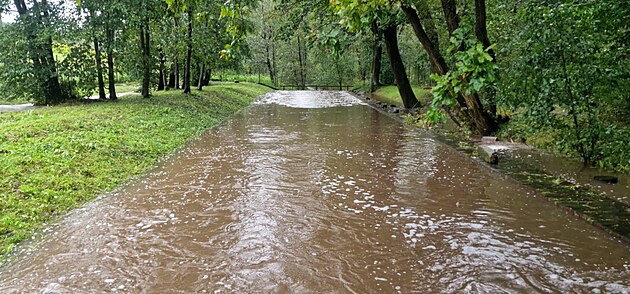 Vyplavený areál pstruží farmy Bělá na Opavsku, odkud odplavalo přes tunu pstruhů. (27. září 2024)