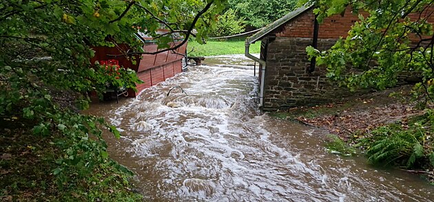 Vyplavený areál pstruží farmy Bělá na Opavsku, odkud odplavalo přes tunu pstruhů. (27. září 2024)