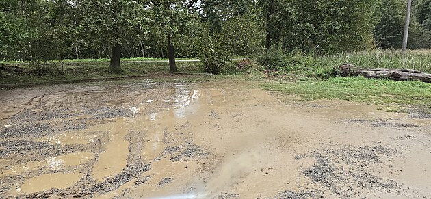 Vyplavený areál pstruží farmy Bělá na Opavsku, odkud odplavalo přes tunu pstruhů. (27. září 2024)