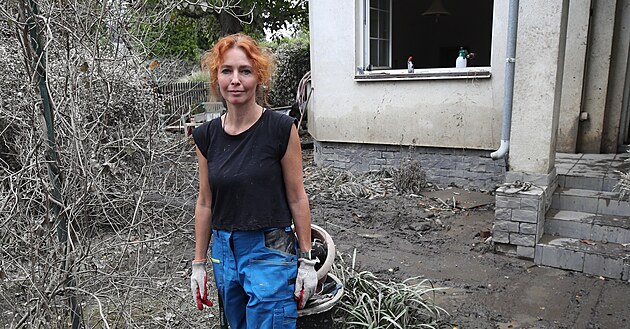 Lucie Návratová před svým domem v poničené ostravské části Nová Ves. Povodeň lokalitu zdevastovala. (24. září 2024)