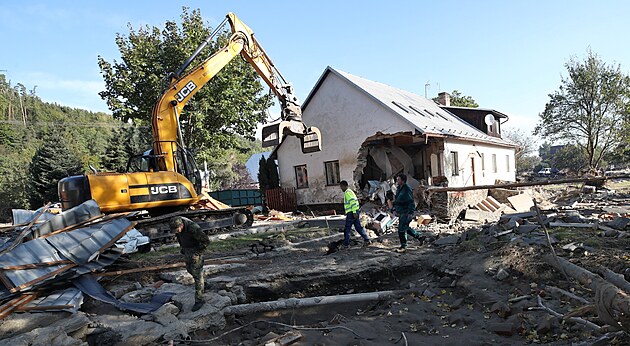 Demolice prvního domu v Zátoru na Bruntálsku, zničeného povodní. Dům č.p. 107 patřil rodině Marie Kolářové, která se v něm narodila. Manžel Lubor za ní přišel z Radkova.