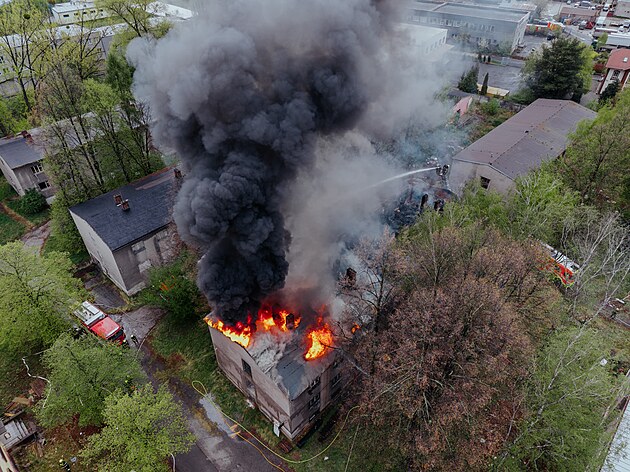 Likvidace požáru opuštěné budovy v Cihelní ulici v centrálním obvodu Ostravy. (18. dubna 2025)