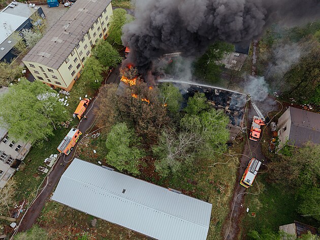 Likvidace požáru opuštěné budovy v Cihelní ulici v centrálním obvodu Ostravy. (18. dubna 2025)