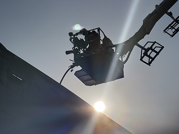 Hasiči při likvidaci požáru haly v průmyslovém parku u mošnovského letiště (14. srpna 2025)
