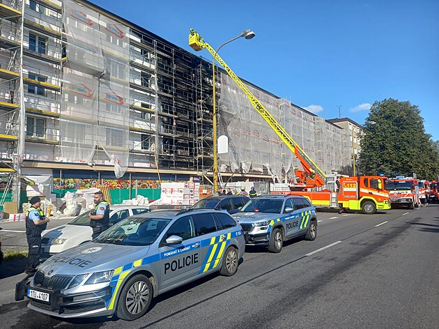 Policisté na místě požáru činžovního domu v centru Havířova, při kterém zemřel jeden člověk. (20. srpna 2025)