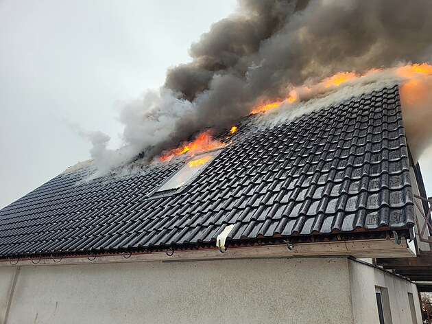 Požár střechy rodinného domu v Krnově, škoda činí dva miliony korun. (12. prosince 2024)
