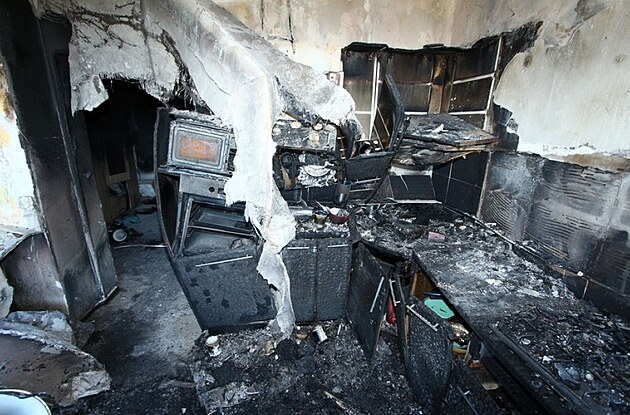 Kuchyně bytu panelového domu v Ostravě - Porubě po požáru. Právě v této místnosti se vařily drogy. (24. května 2025)