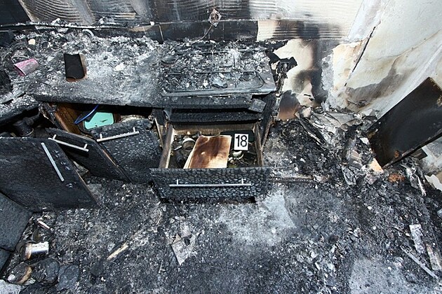 Kuchyně bytu panelového domu v Ostravě - Porubě po požáru. Právě v této místnosti se vařily drogy. (24. května 2025)