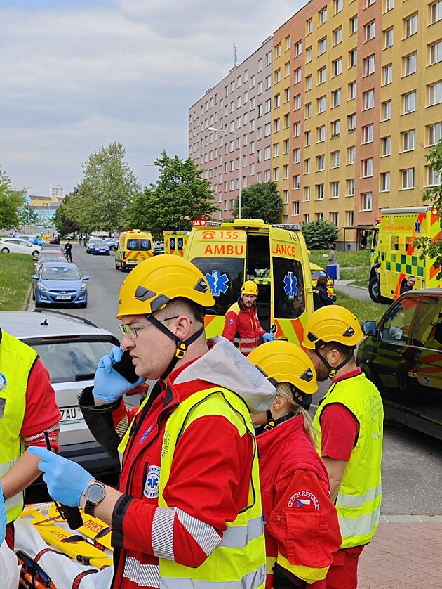 Záchranáři zasahovali u požáru panelového domu v Ostravě - Dubině, kde ošetřili desítky lidí. (7. května 2025)
