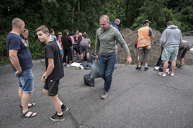 Lidé si v Třinci berou písek, který pro ně připravila tamní radnice ve spolupráci s Třineckými železárnami. Městu hrozí povodeň.