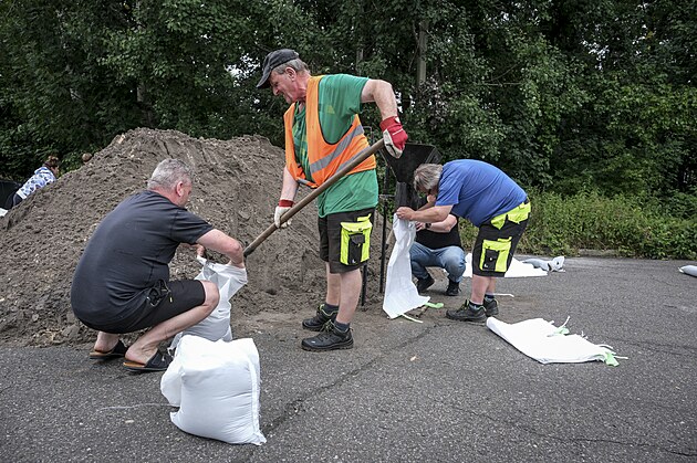 Lidé si v Třinci berou písek, který pro ně připravila tamní radnice ve spolupráci s Třineckými železárnami. Městu hrozí povodeň.