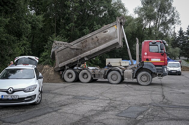 Náklaďáky na třinecké parkoviště před sportovní halou dovezly písek, který pro občany připravila třinecká radnice ve spolupráci s Třineckými železárnami. Městu hrozí povodeň.