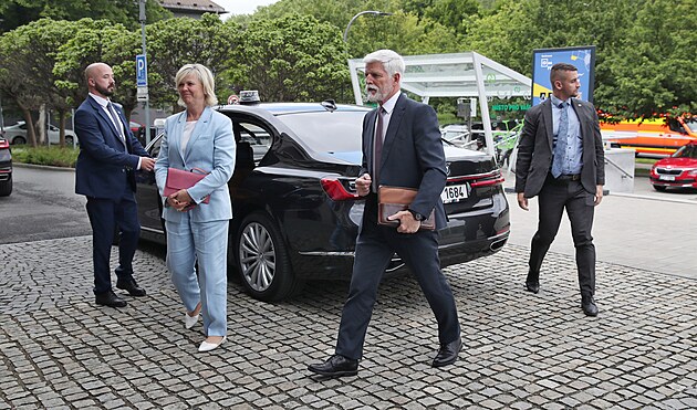 Prezident Petr Pavel první den návštěvy Moravskoslezského kraje navštívil s manželkou Evou hejtmanství Moravskoslezského kreje, kde je přivítal hejtman Josef Bělica (26. květen 2025).