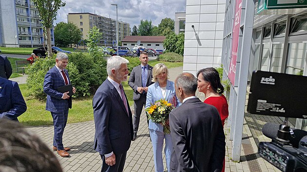 Prezident Petr Pavel první den návštěvy Moravskoslezského kraje navštívil s manželkou Evou hejtmanství Moravskoslezského kreje, kde je přivítal hejtman Josef Bělica (26. květen 2025).