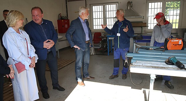 Prezident Petr Pavel s chotí Evou na návštěvě azylového domu Nová šance v Ostravě – Koblově, kde jsou dílny pro bývalé vězně a lidi bez domova. (27. května 2025)