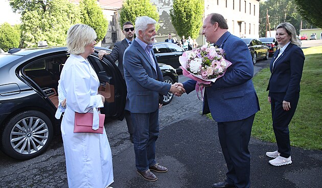 Přivítání prezidenta Petra Pavla a první dámy Evy Pavlové před azylovým domem Nová šance v Ostravě - Koblově, kde provozují dílny pro propuštěné vězně a lidi bez domova. (27. května 2025)