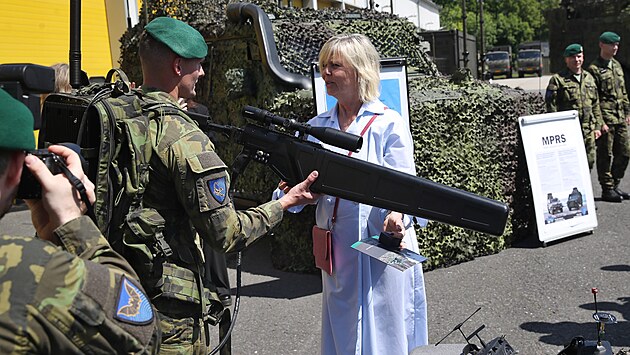 Prezident Petr Pavel si i s manželkou Evou prohlédli opavský areál 53. pluku průzkumu a elektronického boje, kde se seznámili s vojenskou technikou, zejména s drony. (27. května 2025)