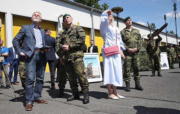 Prezident Petr Pavel si i s manželkou Evou prohlédli opavský areál 53. pluku průzkumu a elektronického boje, kde se seznámili s vojenskou technikou, zejména s drony. (27. května 2025)