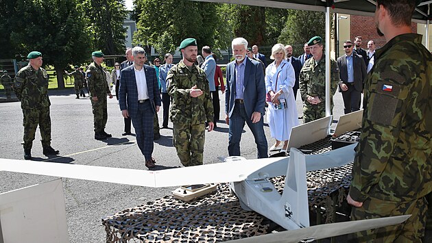 Prezident Petr Pavel si i s manželkou Evou prohlédli opavský areál 53. pluku průzkumu a elektronického boje, kde se seznámili s vojenskou technikou, zejména s drony. (27. května 2025)