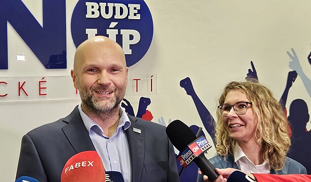 Moravskoslezský hejtman Josef Bělica oznamuje, že se dohodl s SPD na krajské koalici. Vpravo náměstkyně Šárka Šimoňáková. (4. října 2024)
