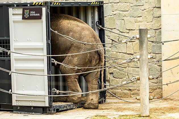 Osmiletý sloní samec trénuje vstup do transportní bedny, ve které se přemístí z Ostravy do Francie. (9. října 2025)