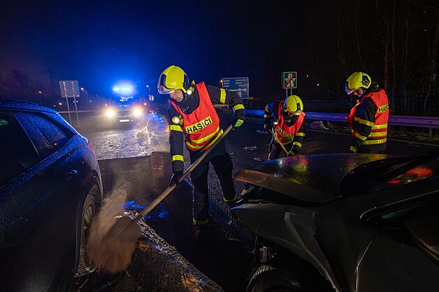 Na dálnici D56 u Paskova se srazily nákladní vůz, dodávka a pět osobních aut, provoz je uzavřen a na místě zasahují všechny složky IZS. (11. prosince 2025)