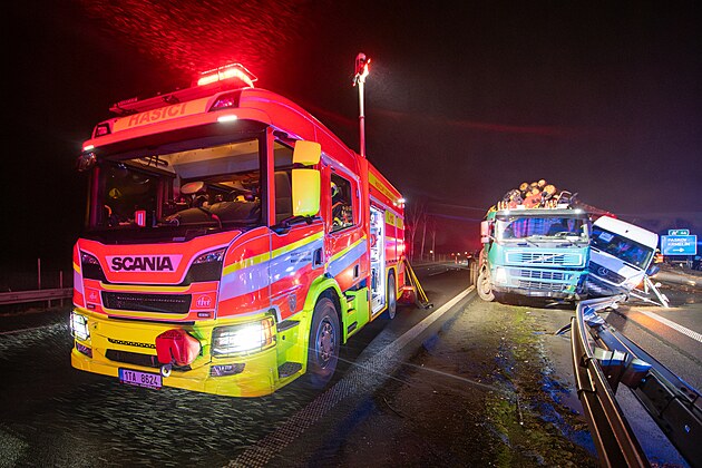 Na dálnici D56 u Paskova se srazily nákladní vůz, dodávka a pět osobních aut, provoz je uzavřen a na místě zasahují všechny složky IZS. (11. prosince 2025)