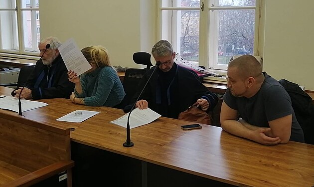 Muž se svou kamarádkou v jednací síni Okresního soudu v Opavě, kde se zpovídají z rabování v době povodní. (13. března 2025)